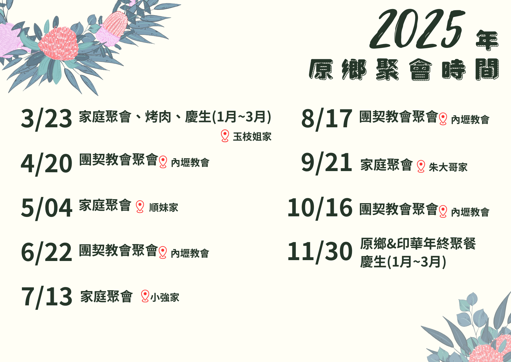 2025團契小組相見歡 動態消息 11 1 月 2025年原鄉&印華聚會日期 2025年 原鄉&印華... Read more 05 1 月 2025.01.05|原鄉&印華團契相見歡 今日相見歡,團契弟兄姊妹彼此再... Read more