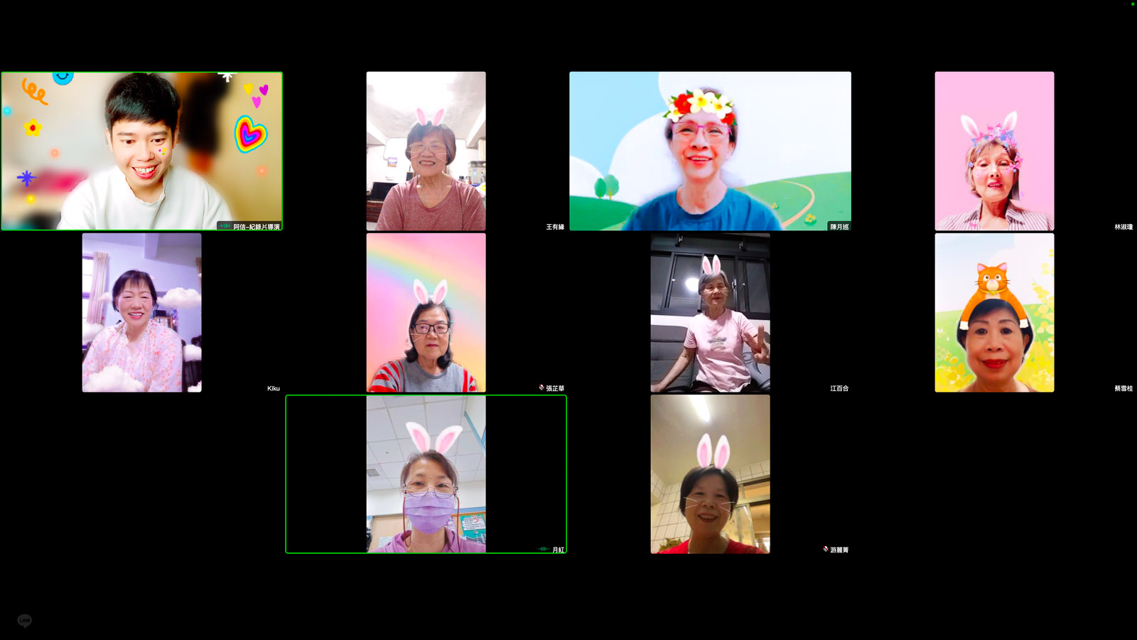 這次的聚會除了彼此代禱與分享近況,我們也特別學習使用 LINE 的視訊特效濾鏡,戴上可愛的兔耳朵、花圈、雲朵背景,每個人都玩得不亦樂乎,笑聲不斷!