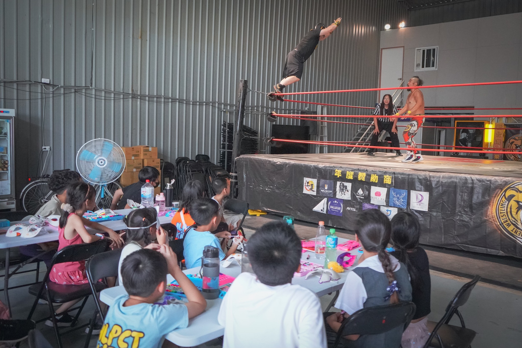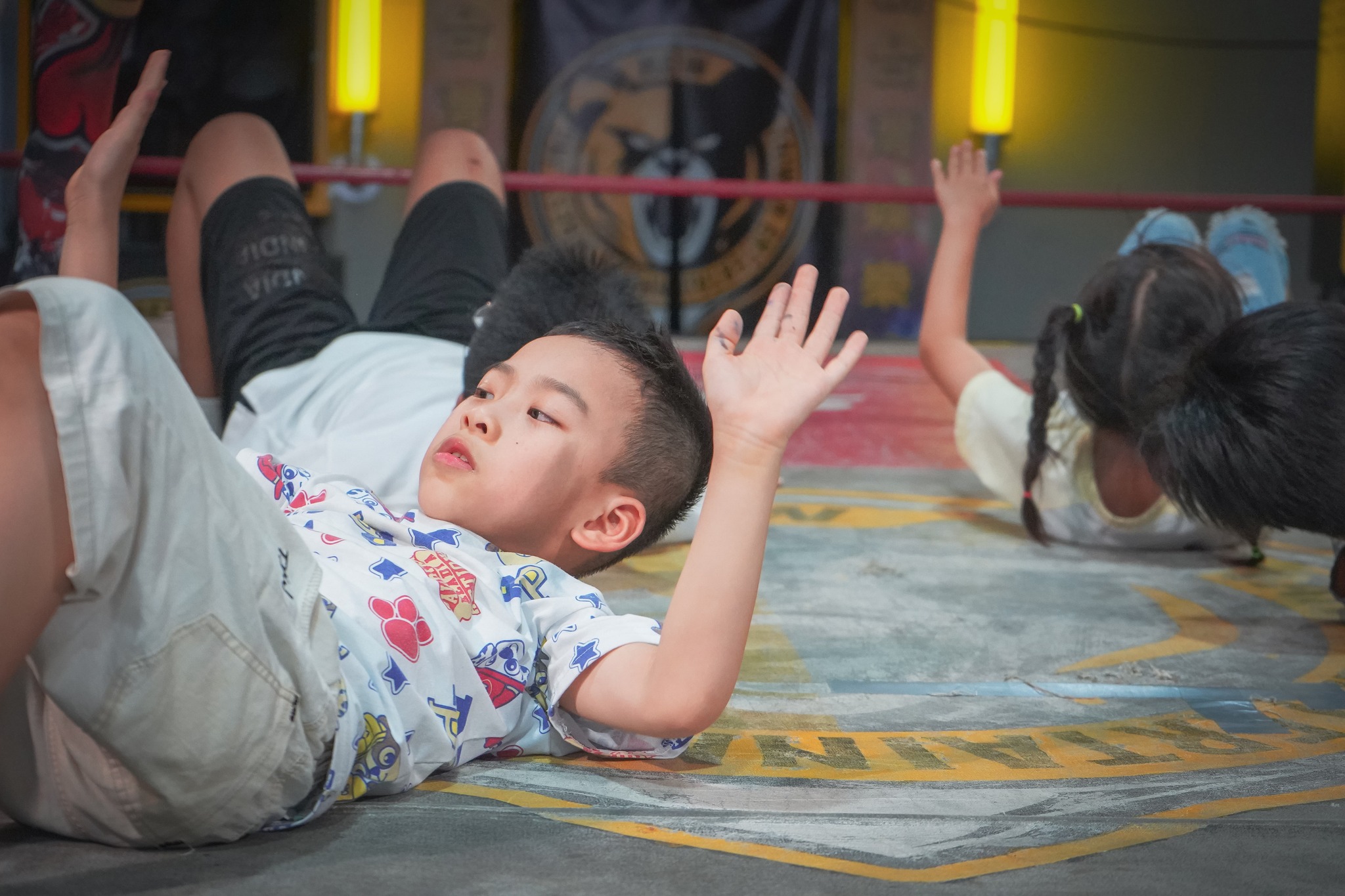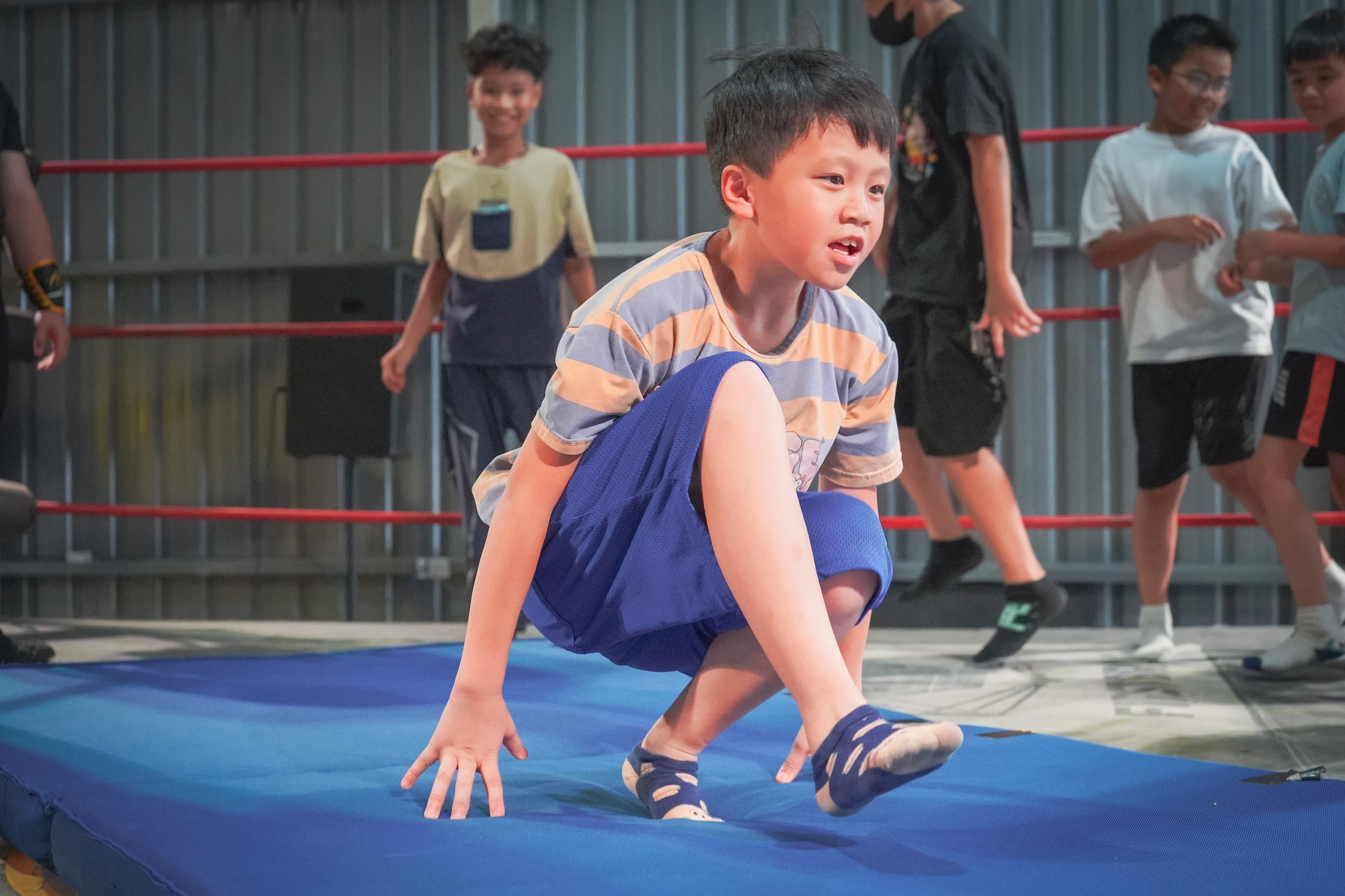 孩子們在擂台上翻滾、奮力嘗試,眼中充滿了驚奇與熱情,每一次倒地都伴隨著歡笑與成就感,也學會了——所有看似華麗的背後,都是一次次練習與堅持的成果。