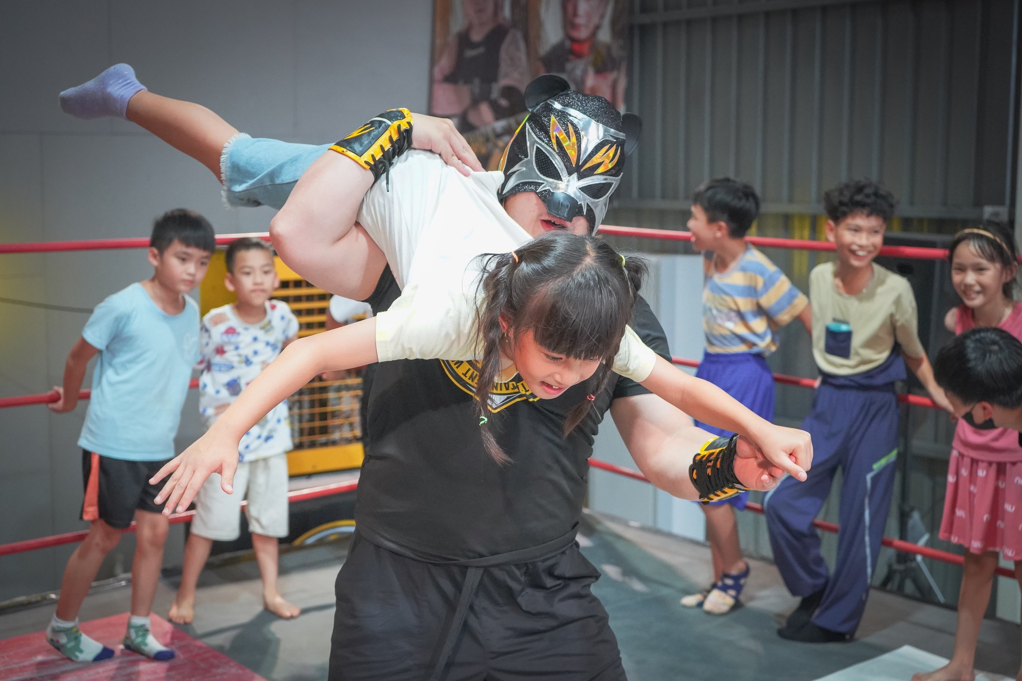 孩子們在專業選手指導下,體驗了摔角的基本技巧:護身倒法、前滾翻、金臂勾等。這些看似驚險的動作,其實背後藏著「如何保護自己、尊重對手」的重要訓練。